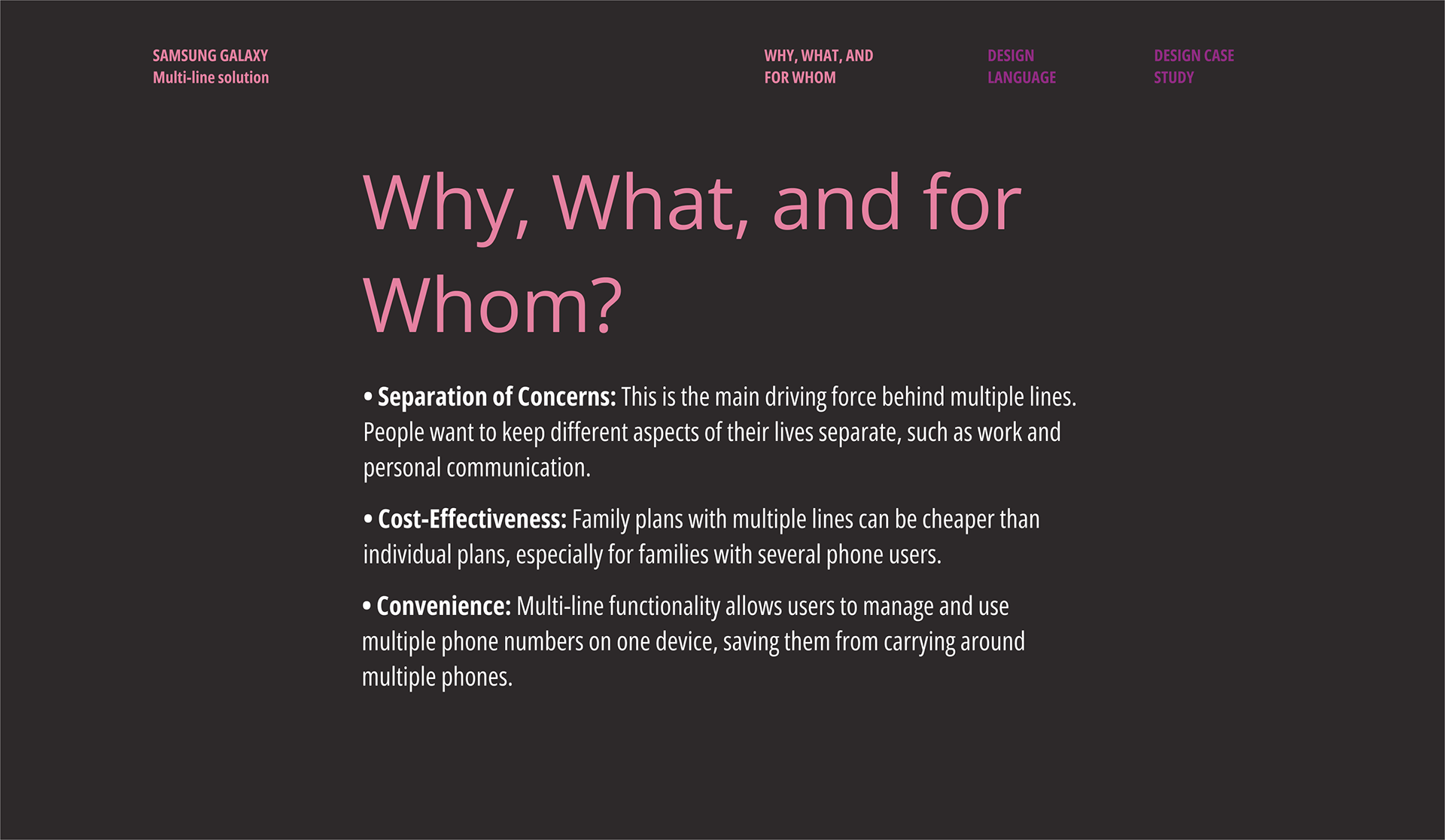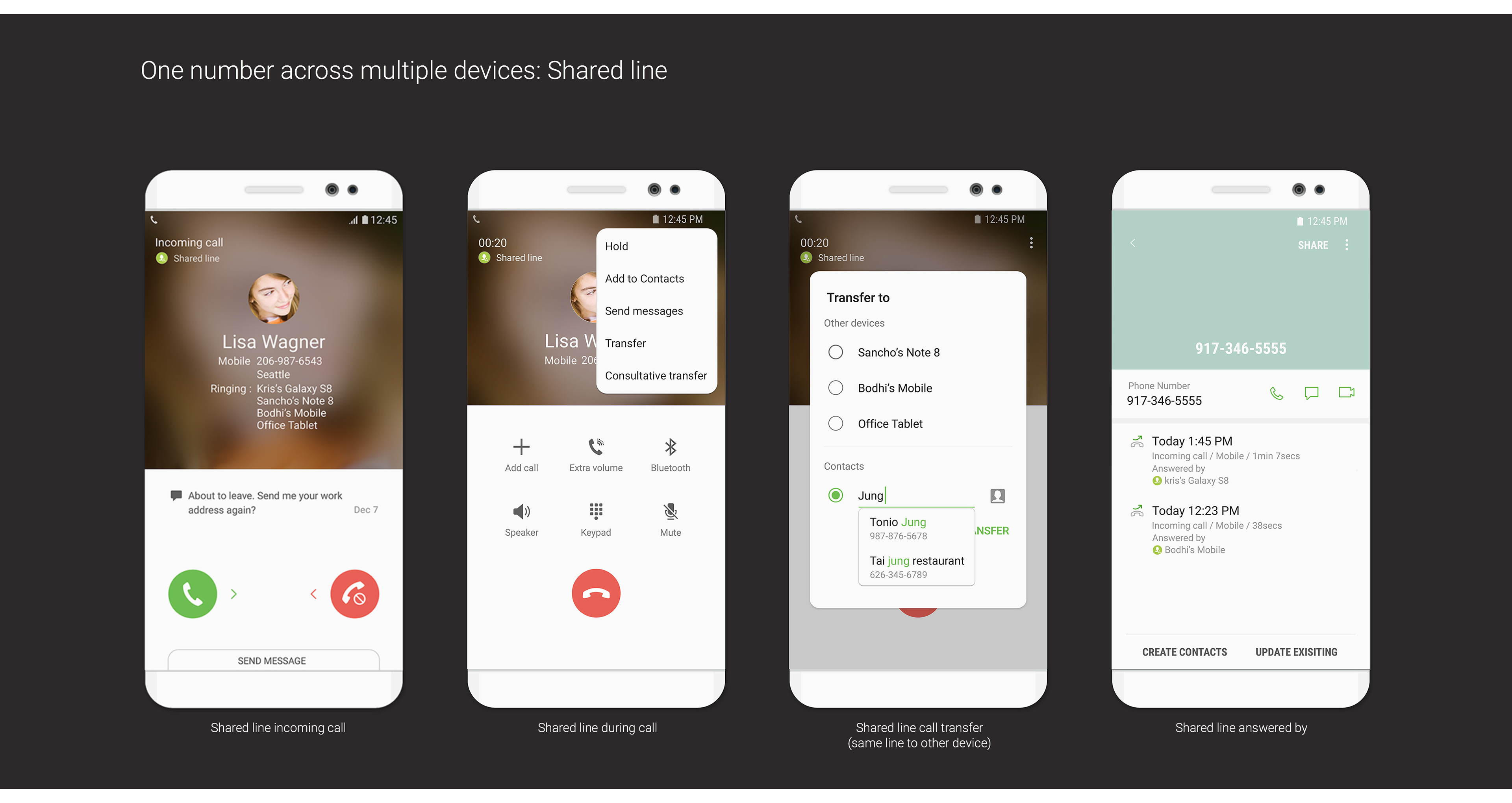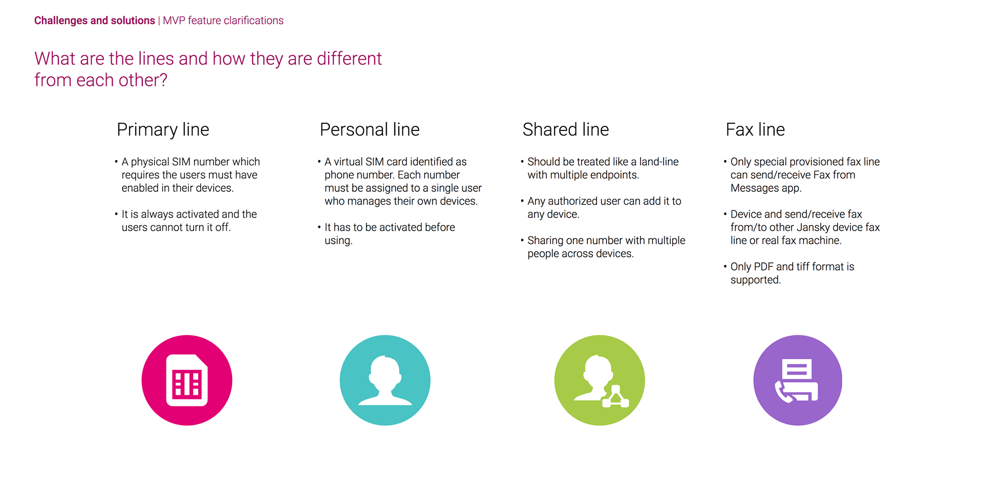 Understanding user needs: Show, Don’t tell My primary focus was on understanding user needs for multiple line functionality on smart phones, particularly the concept of shared lines. A major challenge was establishing a shared vision for the concept of shared lines, which inherently involves some compromise between individual user needs. I created user personas to illustrate the needs for work-life separation, family plans, or managing a business line.