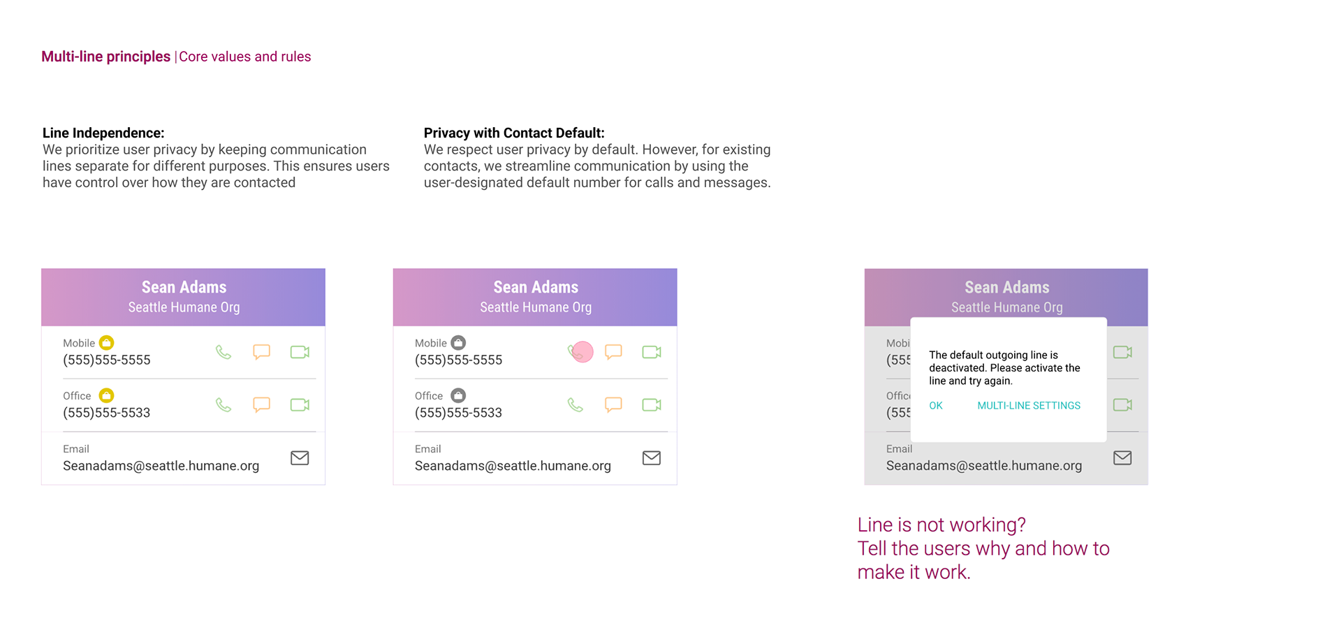 Targeted User Education: While the core experience was designed to be intuitive, we acknowledged that certain functionalities might require initial user education. To address this, we implemented first-time app usage help within the participating apps. This help included guidance on selecting an outgoing line, recognizing line usage within apps, and navigating to product settings for further customization.