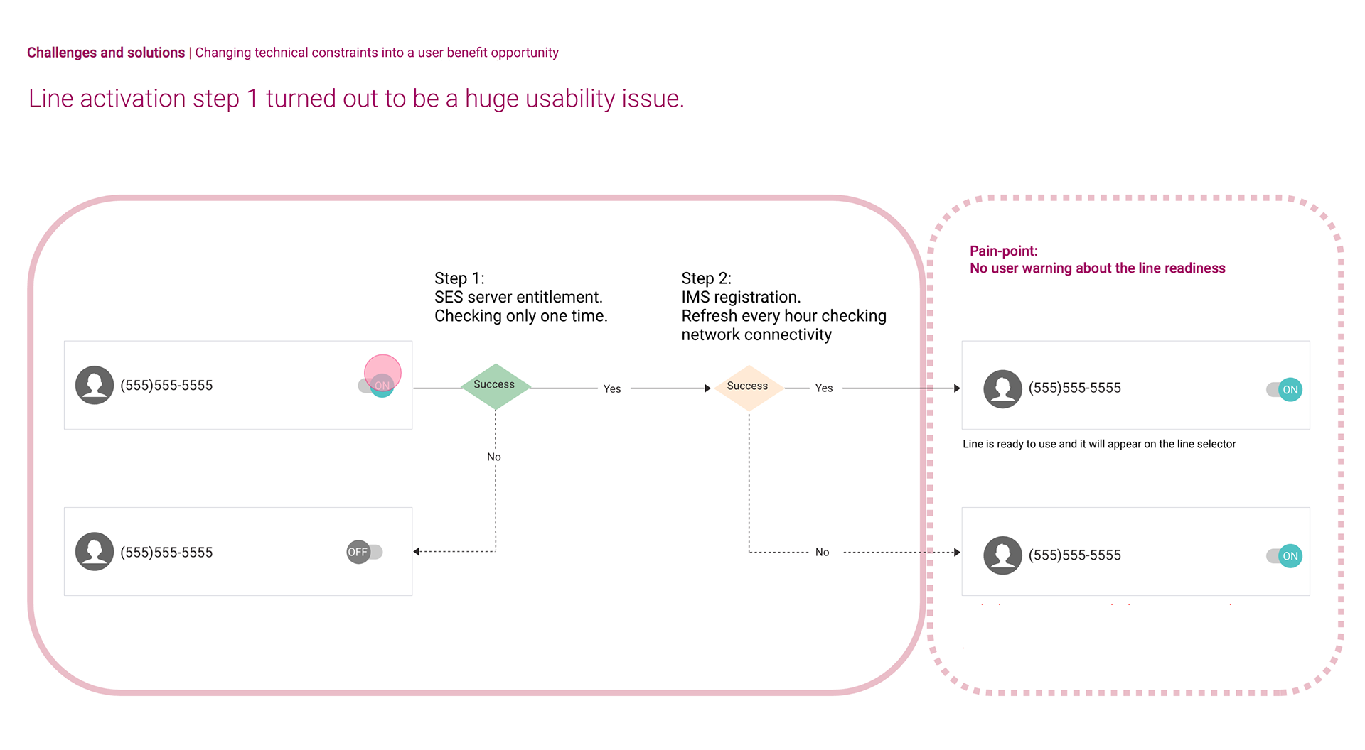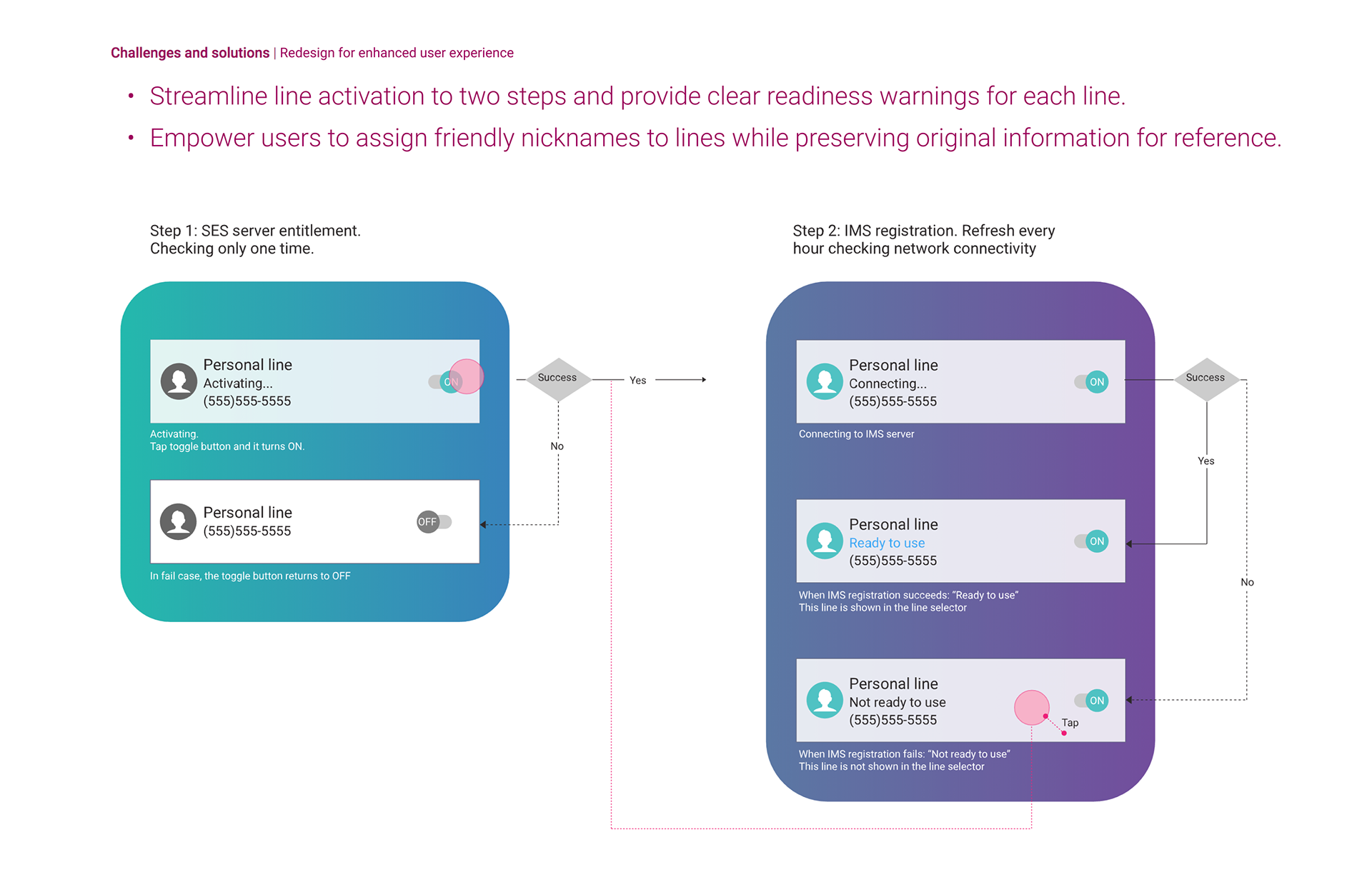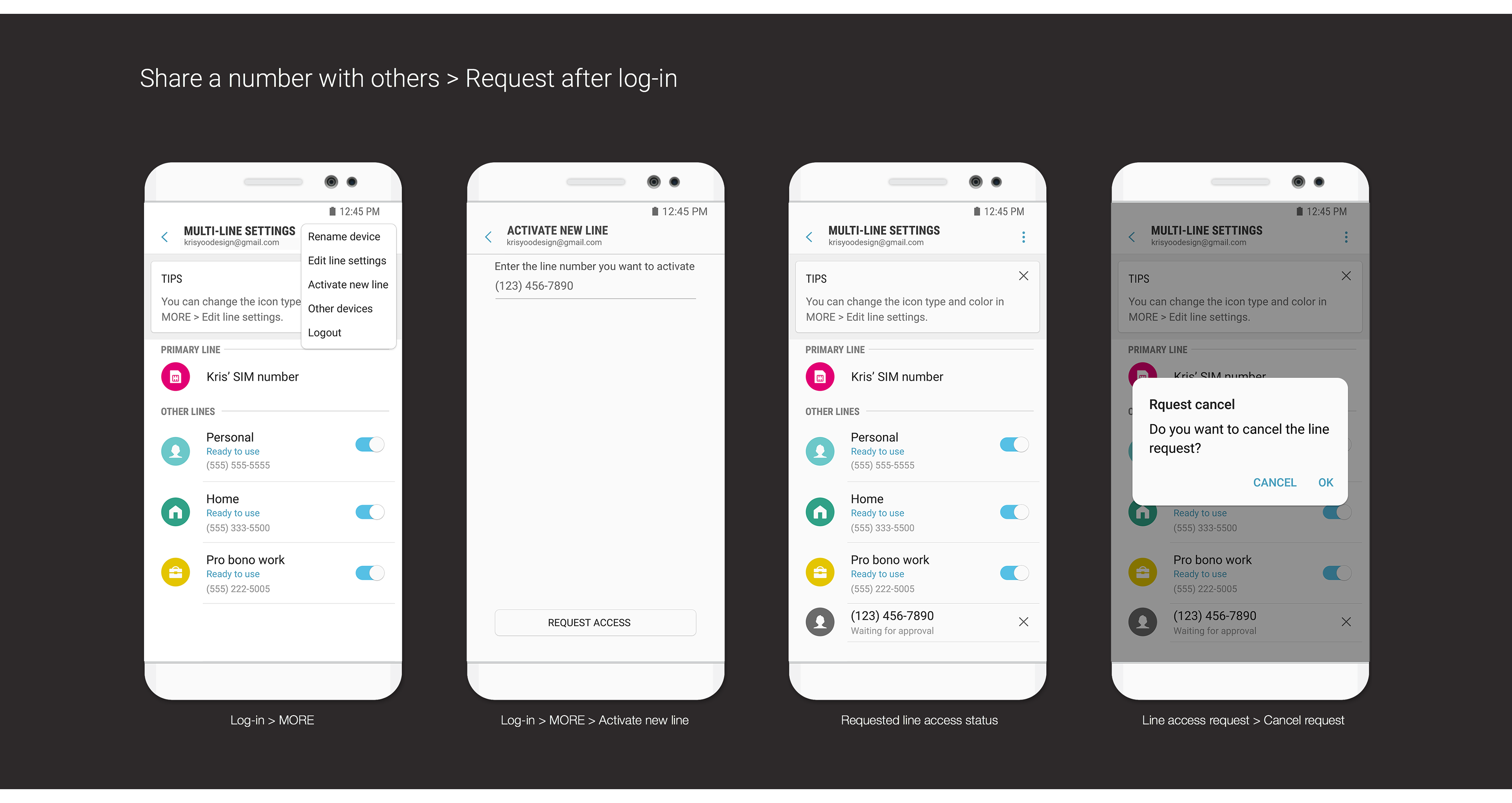 Prototyping and Evaluation: Based on the user research, I developed the user journey with multi-line features. Then, created prototypes, and user flows, which were evaluated with cross-functional stakeholders to refine the user flow for mvp features. This evaluation process allowed us to identify key use cases, user benefits, and refine the information journey. For example, stakeholder feedback helped refine the user flow for switching between multiple lines, ensuring a more intuitive experience.