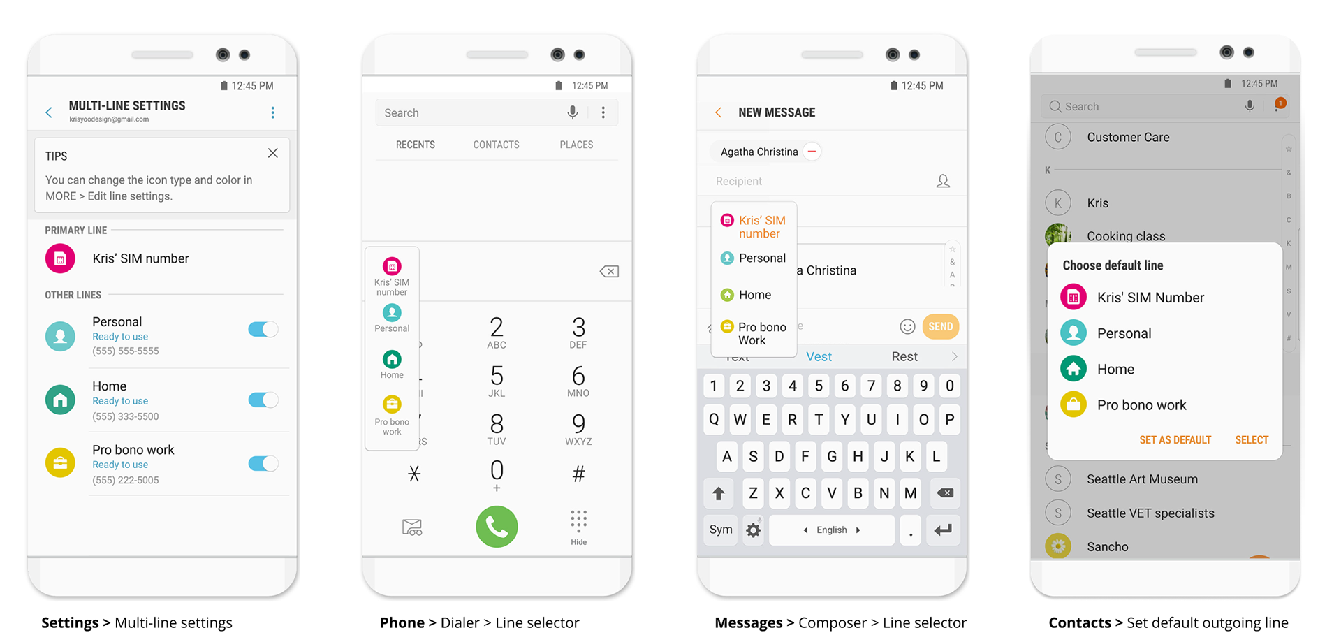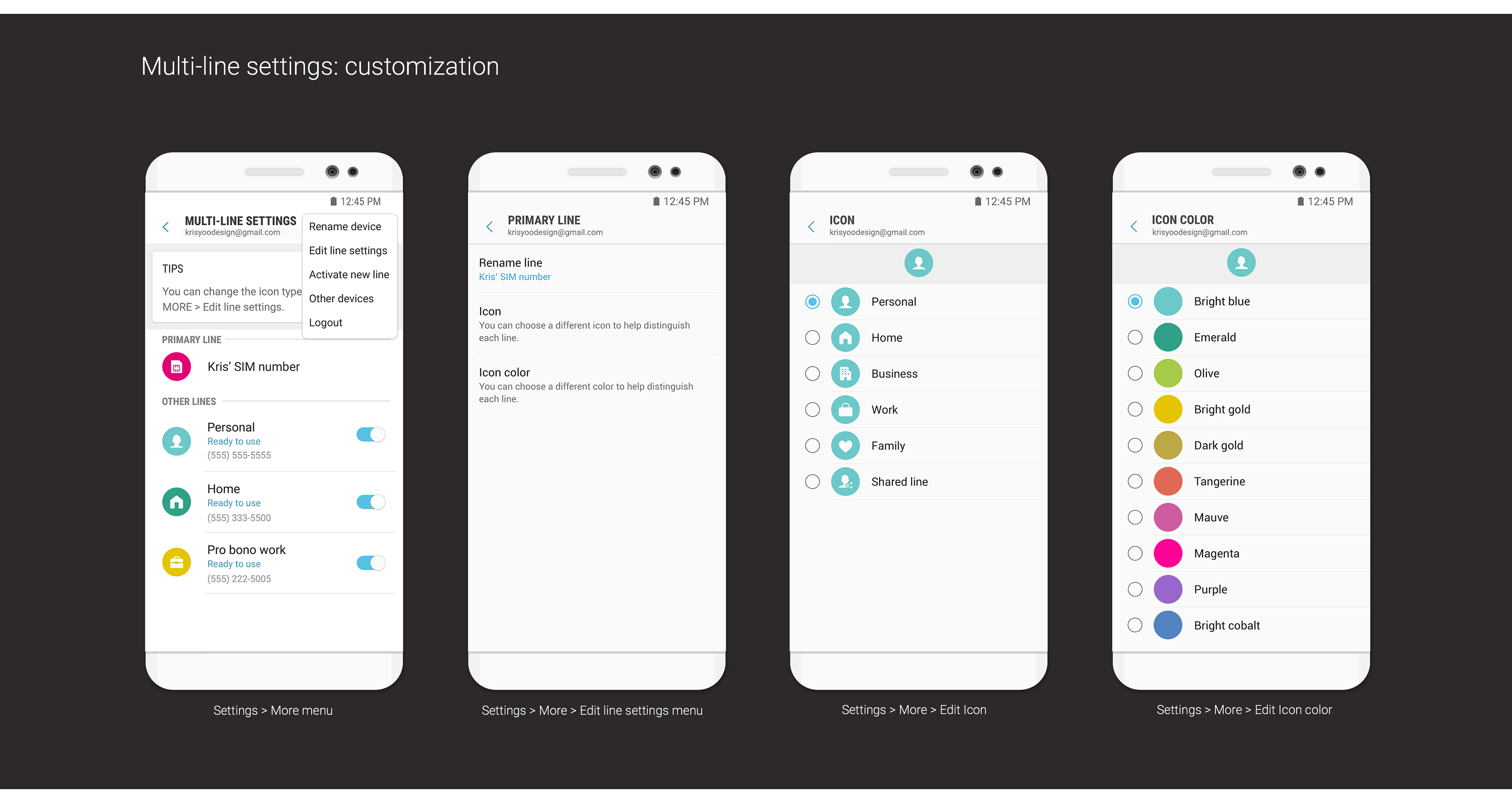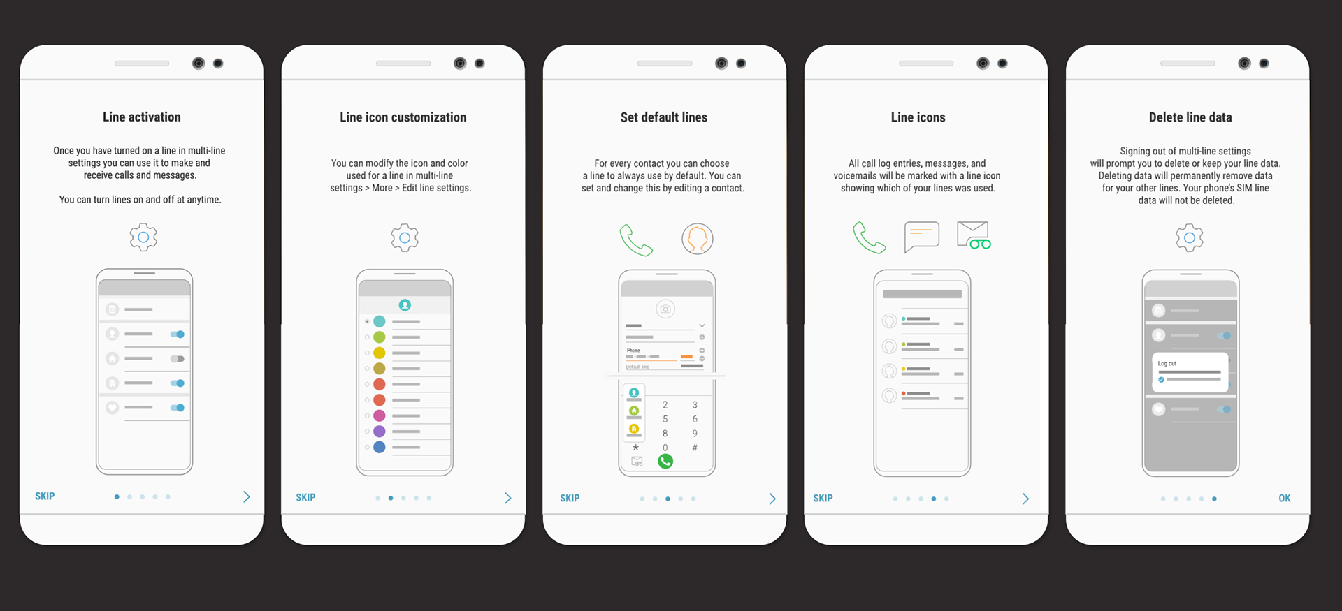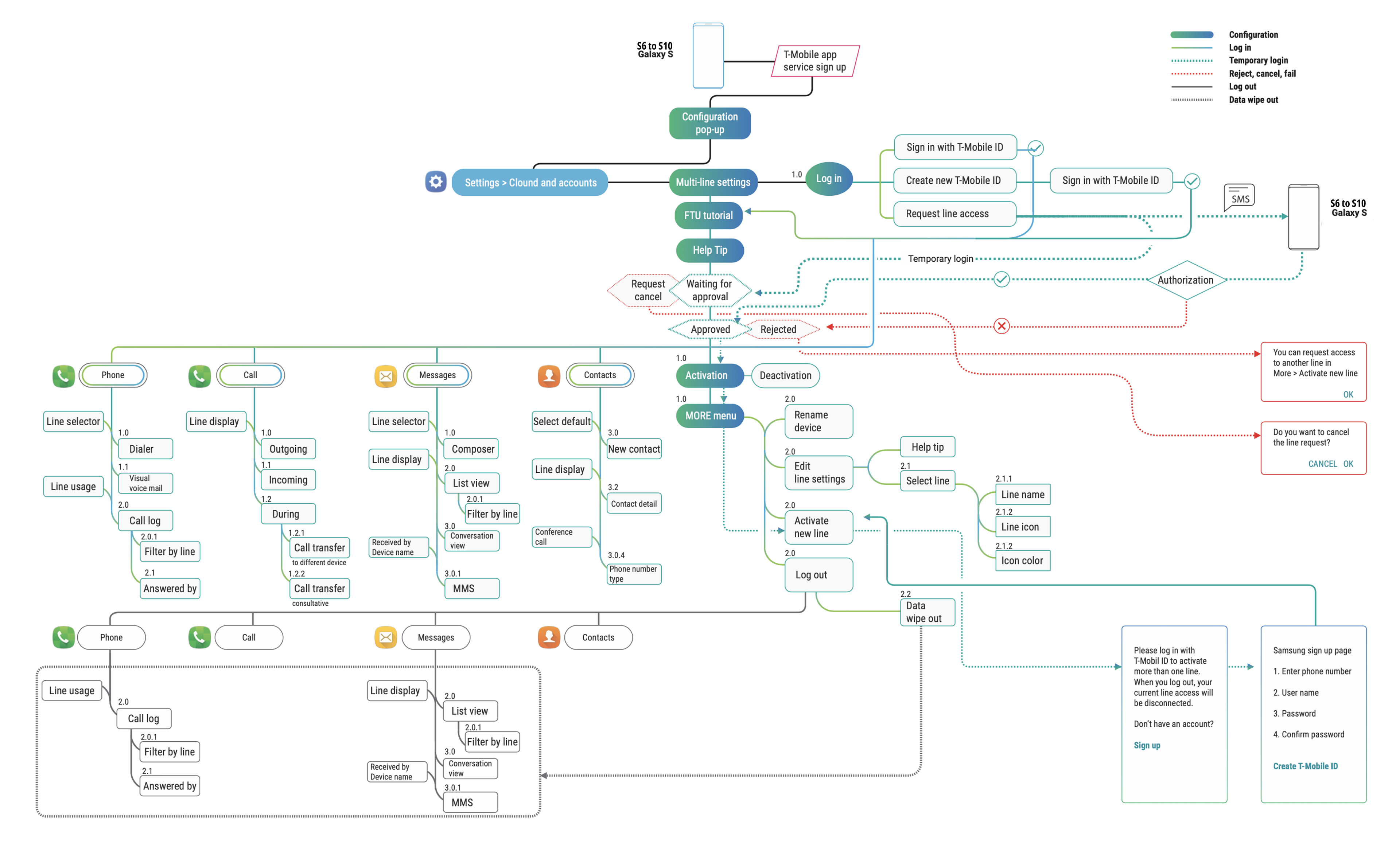 Define design deliverables and collaboration: A comprehensive information architecture and a design language encompassing layout, color palettes, iconography, and typography were established. This design language ensured a cohesive user experience across all multi-line functionalities. While I defined these design elements, the detailed UI design work was delegated to the native apps UX design team at Samsung HQ.